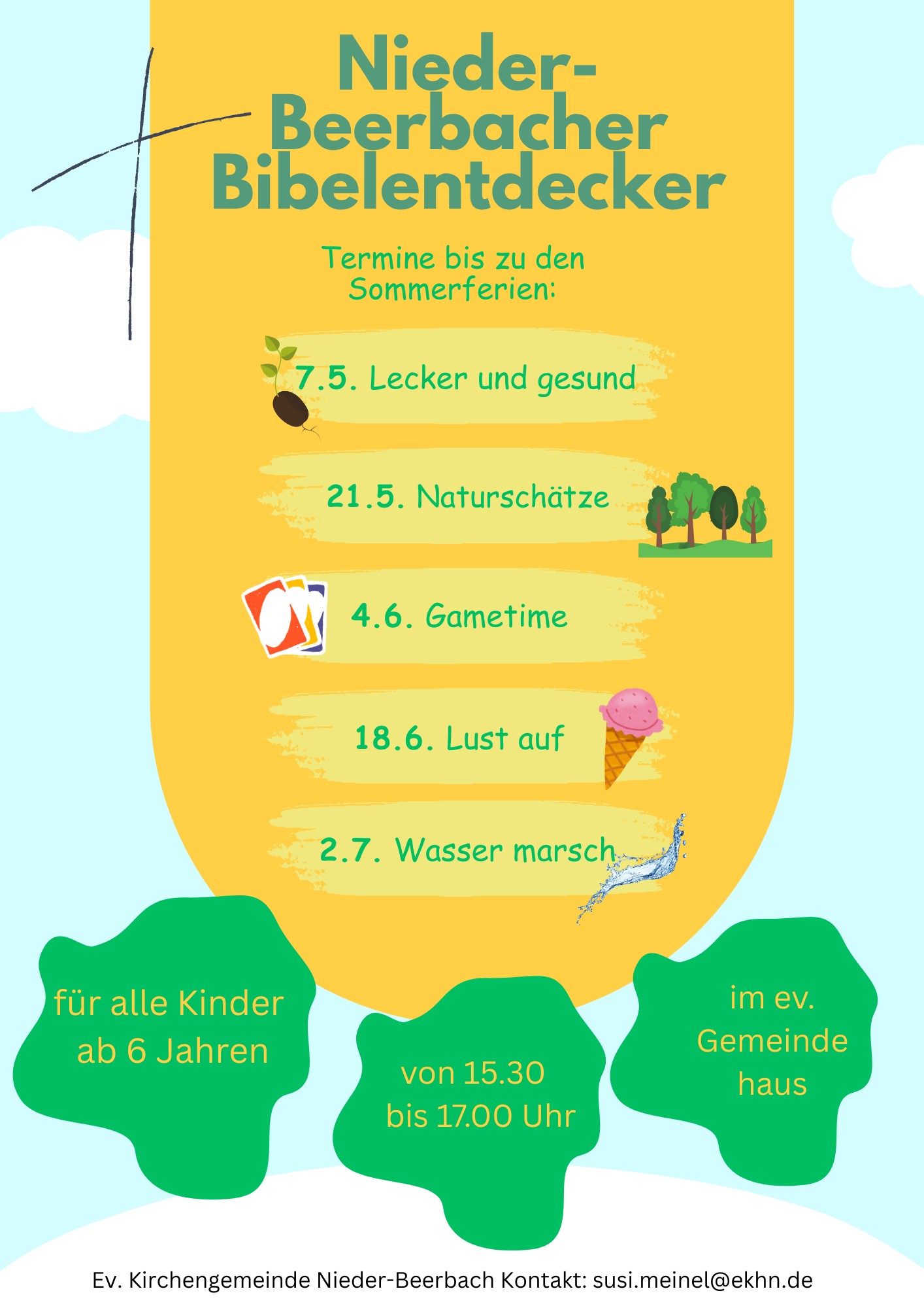 Der Kindergottesdienst findet jeweils am 3. Sonntag im Monat – außer in den Schulferien – im Ev. Gemeindehaus in Nieder-Beerbach von 11.15 Uhr bis 12.15 Uhr statt.