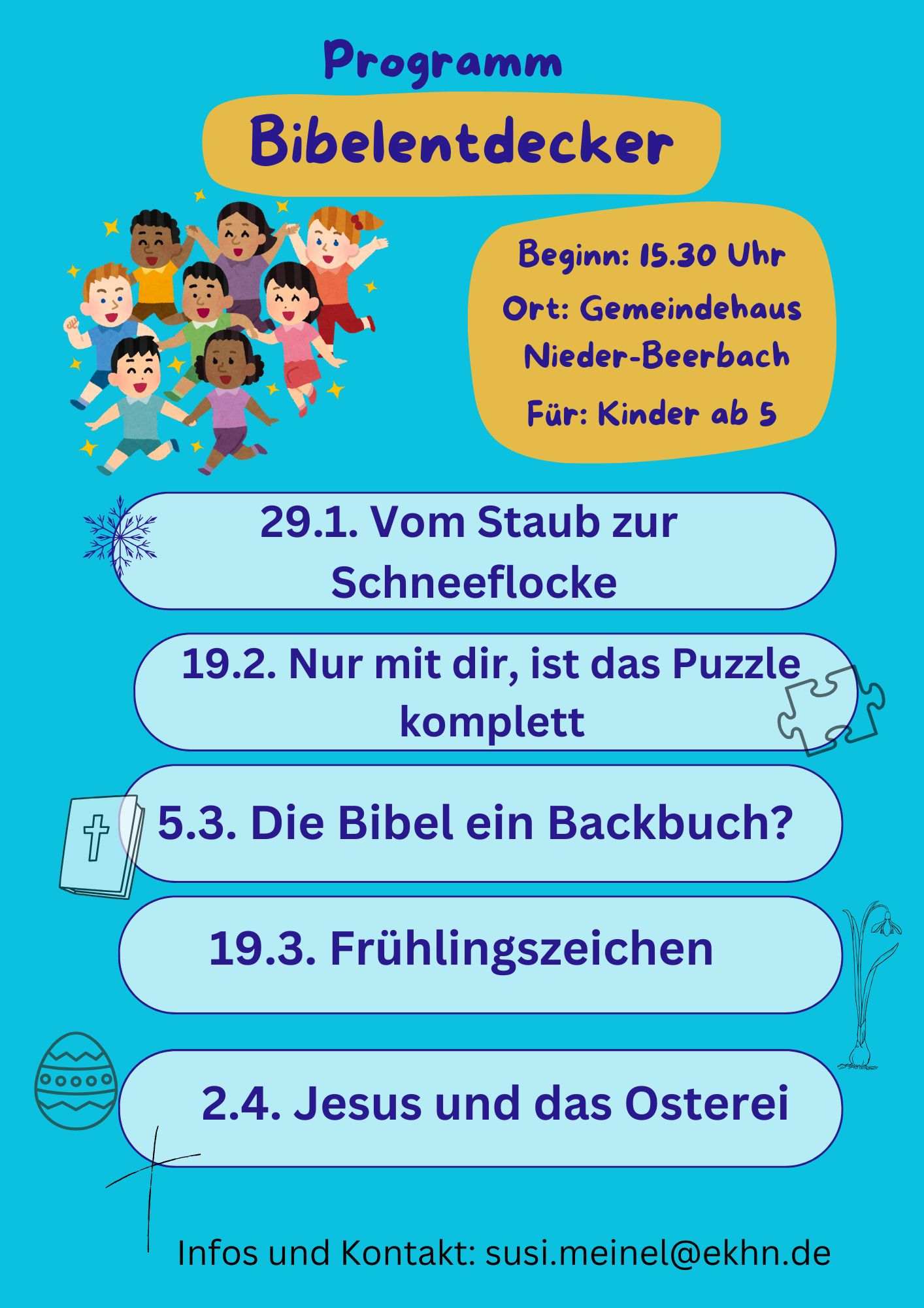Kindergruppe „Bibelentdecker“, jeweils um 15.30 Uhr im Ev. Gemeindehaus.